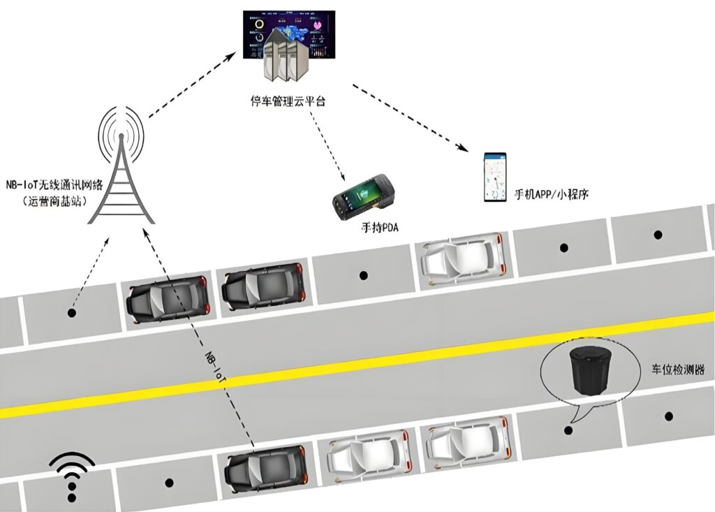 地磁车位检测器安装在每个车位的地面,获取车位的实时状态信息并通过窄带物联网(NB-IoT)发送给中央处理模块,在分析处理信息后,中央处理模块将处理后的车位信息发送到输出显示模块,后者通过LED显示屏、指示灯和手机app等形式给车主提供空车位的信息和导航路线,引导车主找到空车位。